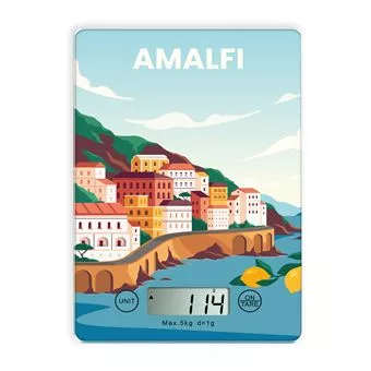 Plateau verre décor Amalfi dimension 16*23*2cm Capacité 5KG au gramme près. Choix de l’unité de mesure . Fonction tare