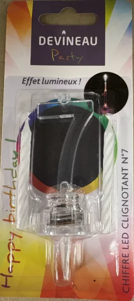(H.T.)Accueil » Anniversaire » Bougies » Droguerie » FS blister 4 bgies + chiffre 7 led clignotant